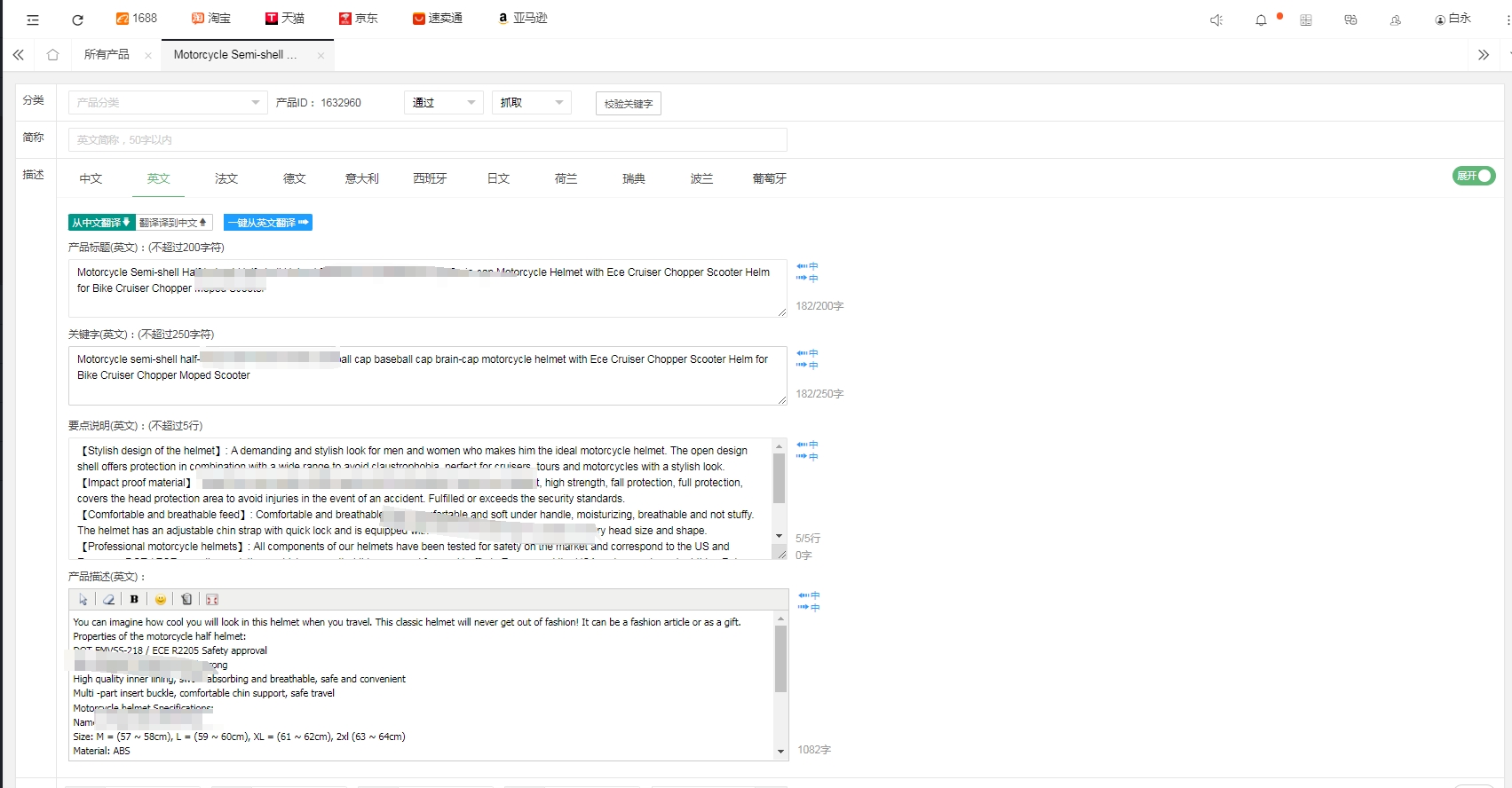 進入產品詳情頁,進行產品制作,包含標題、關鍵詞、要素及詳情描述等,如下圖所示: